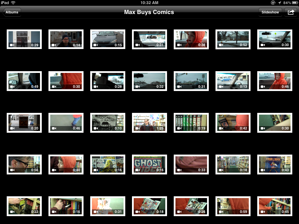 So, in the end I spent about 90 minutes filming Max and Mike buying comics, a few minutes moving files around, and hour of editing and about 20 minutes processing the film. That is just about three hours for a five-minute video—not that much longer than a night’s reading assignment in one of my classes. In other words, making a film on an iPad can easily be a single night’s homework assignment.