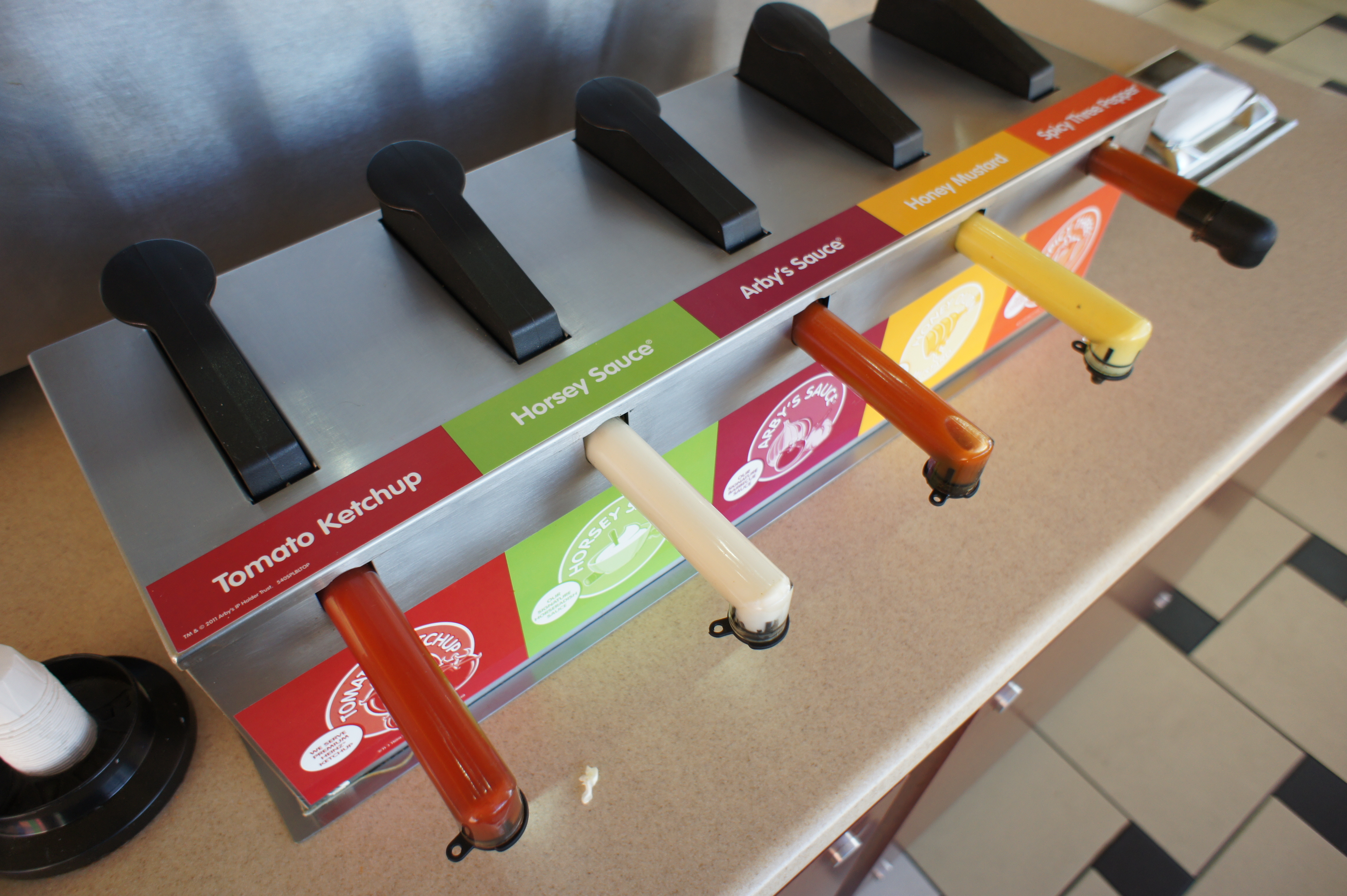 I found a seat across from a most amazing object—a dispenser of five different sauces. The dispenser, done in bright colors, promised me the choice of ketchup, Horsey Sauce®, Arby’s Sauce®, a mustard or Spicy Three Pepper® sauce. Admittedly, only a few of the sauces would likely taste good on my fish sandwiches, but the choice that the dispenser offered made me consider trying every flavor.