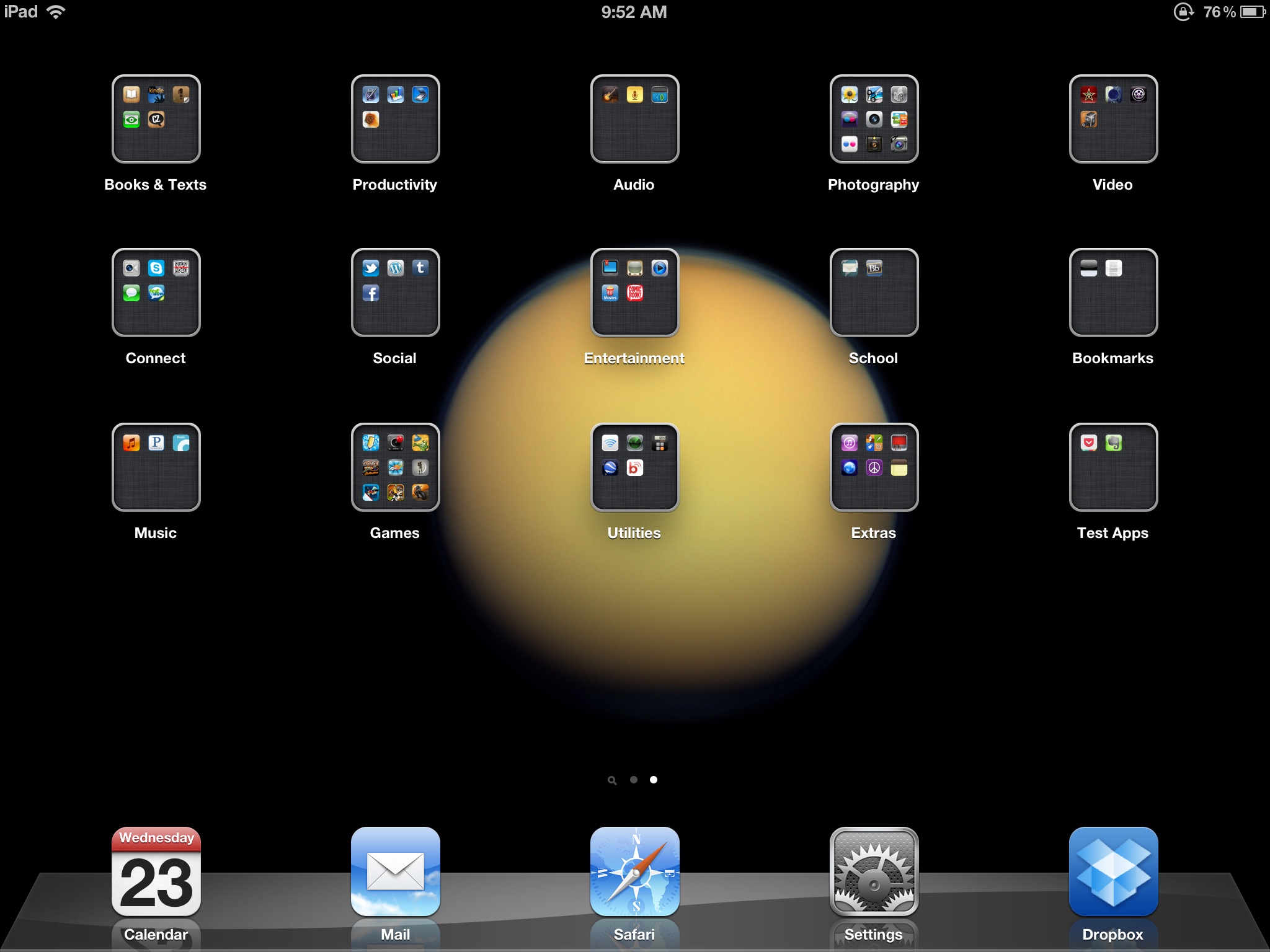 For the past two years a number of friends and colleagues have asked me about how I use my iPad in the classroom and in my professional work. Often it is because they are either thinking about buying an iPad, or they have just acquired one and are curious how it can be used. Generally I have responded with eager on-the-spot impromptu iPad consulting, which probably only overwhelmed and confused. Last night I received another request for iPad information—a Facebook message from a colleague who just got a new iPad and wanted to know what apps I use. Rather than type out a short message, or meet for a face-to-face chat, I decided to finally sit down and write a blog post about the apps I use most often as a college professor. My plan is to try and keep it straightforward, simple, and updated. I have my iPad divided up into three simple sections: The Dock, The Main Page and Page Two. (The fuzzy yellowish orb in the middle of my iPad’s desktop screen is an image of Saturn’s largest moon, Titan, from the Cassini-Huygens mission.)