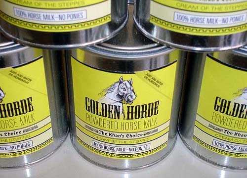 The reality of actual social and cultural difference is stretched to the breaking point of believability. In fact, the most recent email I received does exactly this. Compared to earlier versions it has added three additional images which are completely fabricated. The Meat Water is a beverage satire, the image of the pickles with the frog is discussed in a post on Snopes, and the Golden Horde Brand powdered horse milk (with no ponies!) is a fake brand apparently sold at the Echo Park Time Travel Mart in Los Angeles. Since the email semiotically argues that a Chinese Walmart isn’t a real Walmart then the inclusion of fake products is just a natural extension of the underlying logic of the message.
