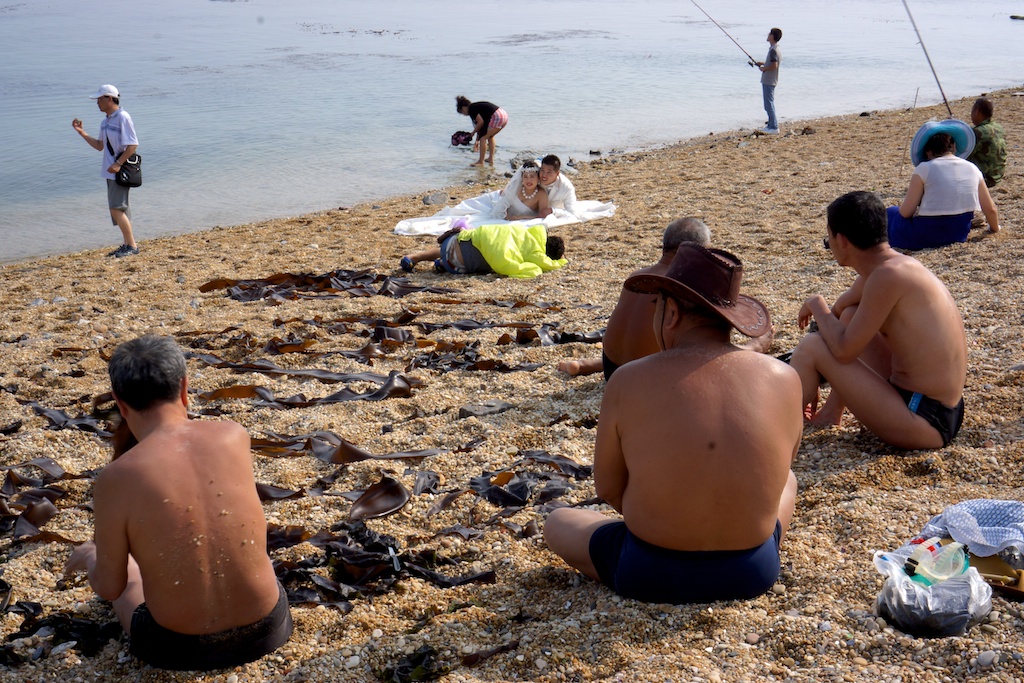 Fujiazhuang Beach in Dalian presents a dizzying array of of activities and actions, social and personal trajectories of participation and involvement—all jostling up against one another on a small strip of sandy shore. My first day there, as I walked its length I saw a huge group of Russian children having a squirt gun fight next to Chinese couples cuddling nearly fully clothed on beach blankets. While some young men fished at the shore, a large group of retirees sat sunning themselves in blue bikinis collecting and drying kelp. A few kids ran around at the water’s edge collecting miscellaneous sea objects.