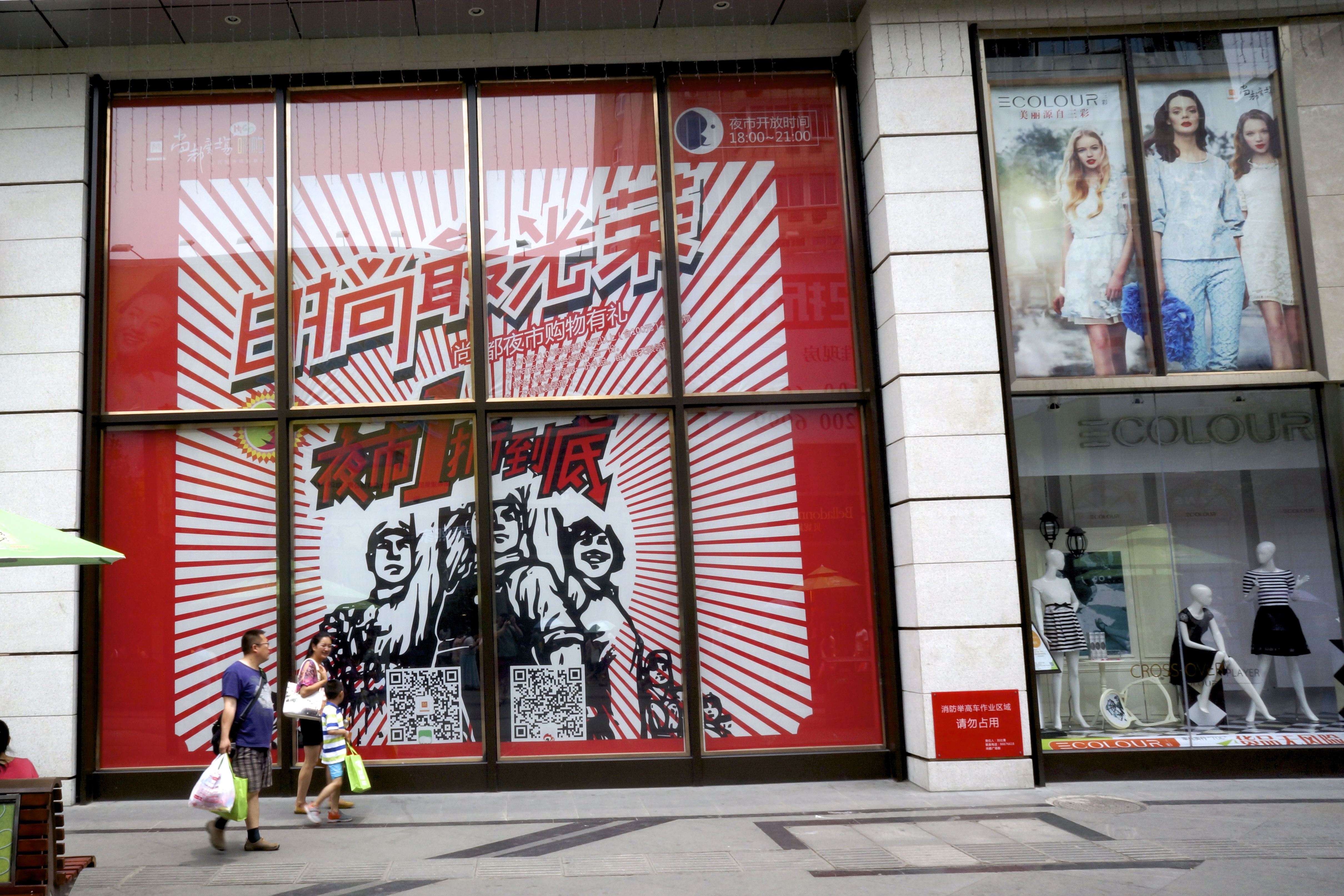 Walking on Chunxi Lu in Chengdu I passed a full sized advertisement which draws upon the imagery and language of the Cultural Revolution. Featuring a worker, peasant, soldier trio the text plays on slogans common during the CR. The CR slogans I’m familiar with, but I’m a bit unsure about the exact translation of the edited ones in the advertisement, so hopefully someone can help me with this. Below I have given my best shot at these phrasings and then put a good guess as to the original revolutionary slogan below it.