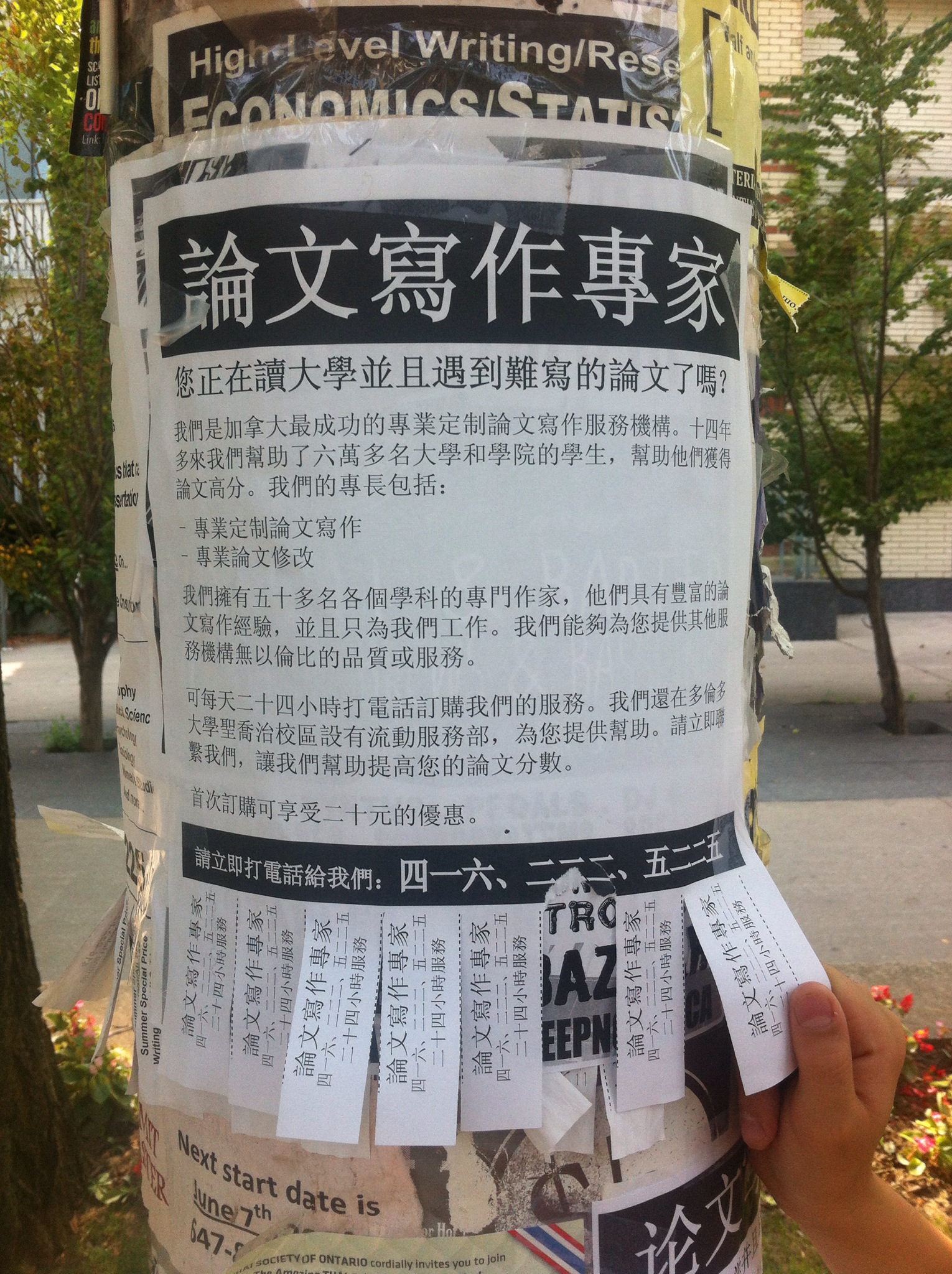 Yesterday while enjoying a walk through the University of Toronto campus I noticed hundreds of fliers taped up on information boards and utility poles advertising the professional essay writing services. These were special, however, because they were entirely in Chinese (in both simplified and complex character versions) clearly targeting a specific client base. Most interesting to me was that even the phone number was written in Chinese characters something that is not a common convention. Clearly they didn’t want to attract that much attention.