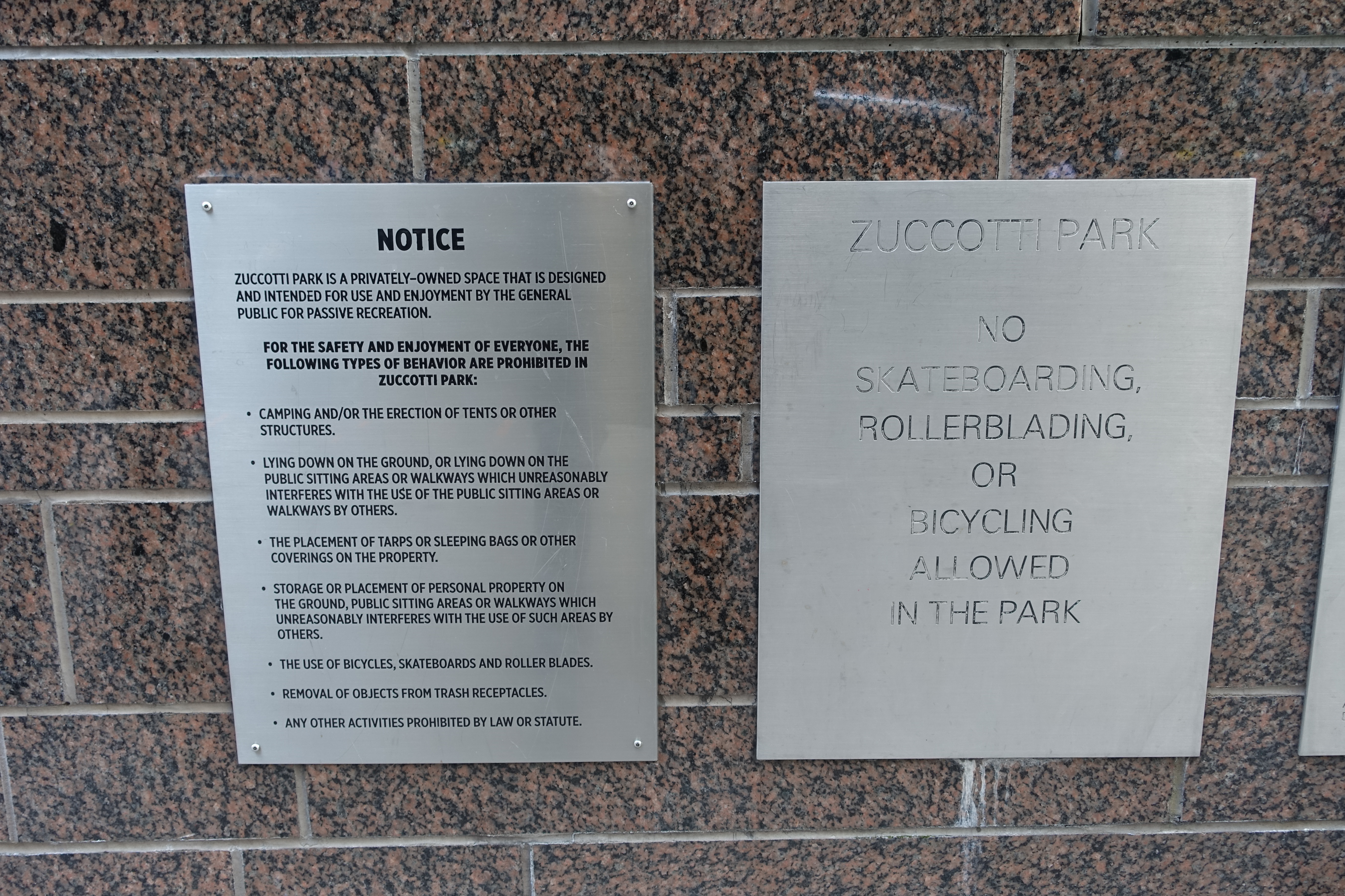 This past weekend, while in New York City I walked through Zuccotti Park, the birthplace of Occupy Wall Street. I couldn’t help but notice the new notice that was clearly much more recently installed than the earlier weathered notice beside it.