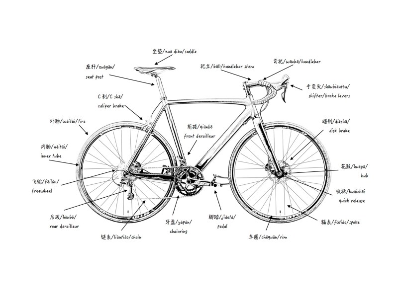 Since knowledge wants to be shared, I thought that I’d share the diagram that I made from our conversation. Here is a PDF of the Chinese English Bike Diagram I’m planning to do another one with more detailed descriptions of different parts sometime soon and I’ll be sure to share that one too!
